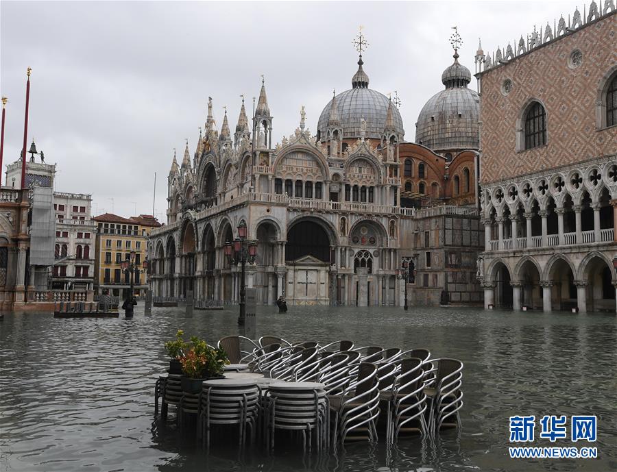 这是11月17日在意大利威尼斯拍摄的受洪水侵袭的圣马可广场。 受极端天气影响,威尼斯近日遭遇严重洪灾。 新华社发(埃莉萨·林格里亚摄)
