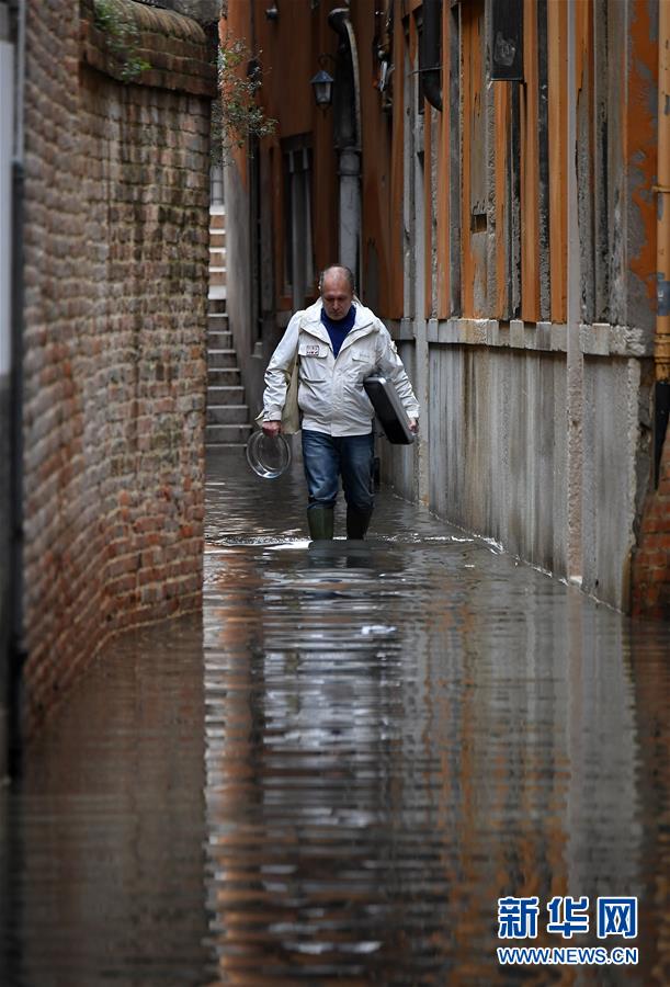 11月17日,在意大利威尼斯,一名男子涉水出行。 受极端天气影响,威尼斯近日遭遇严重洪灾。 新华社发(埃莉萨·林格里亚摄)
