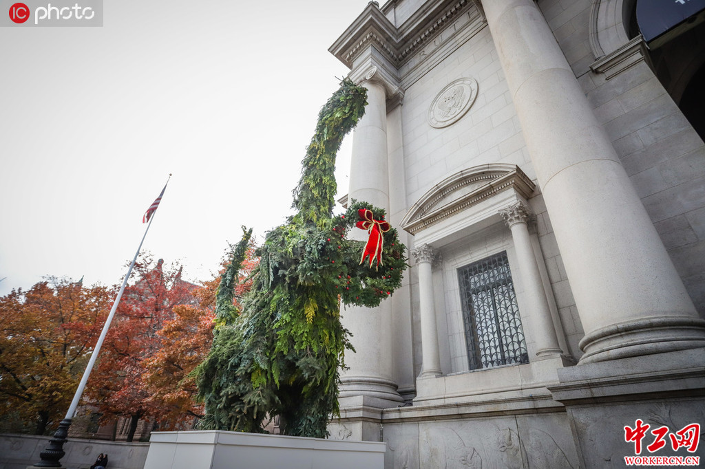 当地时间2019年11月17日,美国纽约,纽约自然历史博物馆前当天安装了一个恐龙造型的圣诞树,预热圣诞氛围。图片署名: /zuma/IC photo
