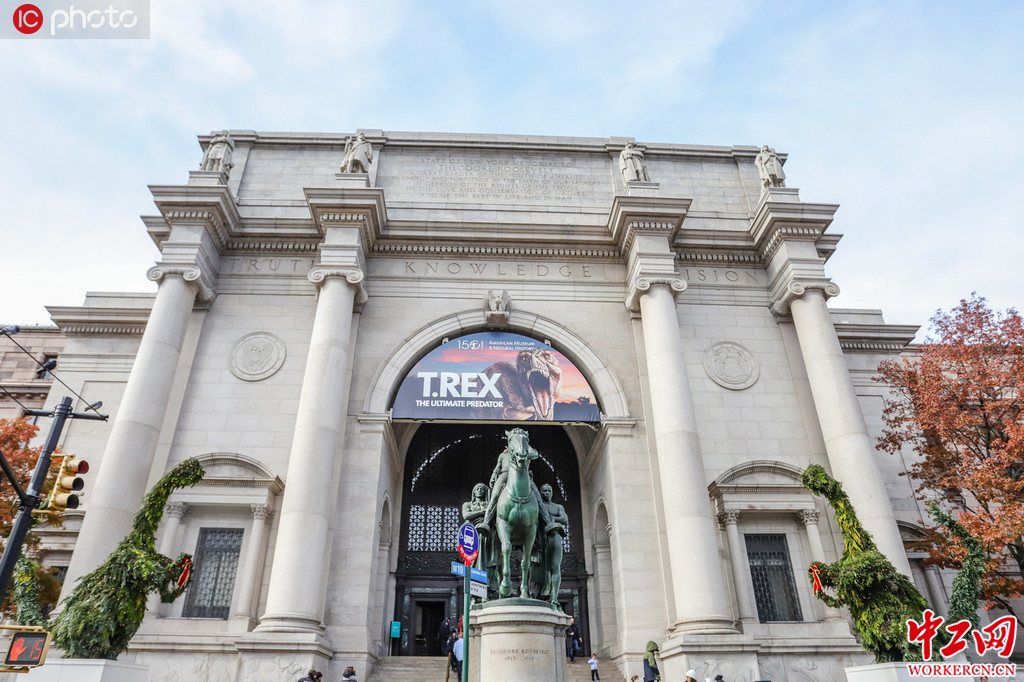 当地时间2019年11月17日,美国纽约,纽约自然历史博物馆前当天安装了一个恐龙造型的圣诞树,预热圣诞氛围。图片署名: /zuma/IC photo