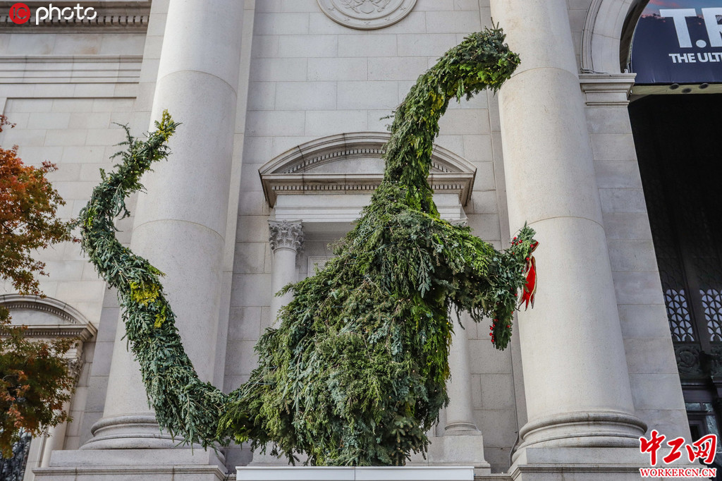 当地时间2019年11月17日,美国纽约,纽约自然历史博物馆前当天安装了一个恐龙造型的圣诞树,预热圣诞氛围。图片署名: /zuma/IC photo