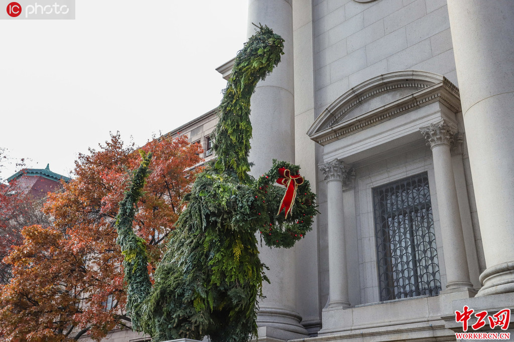 当地时间2019年11月17日,美国纽约,纽约自然历史博物馆前当天安装了一个恐龙造型的圣诞树,预热圣诞氛围。图片署名: /zuma/IC photo