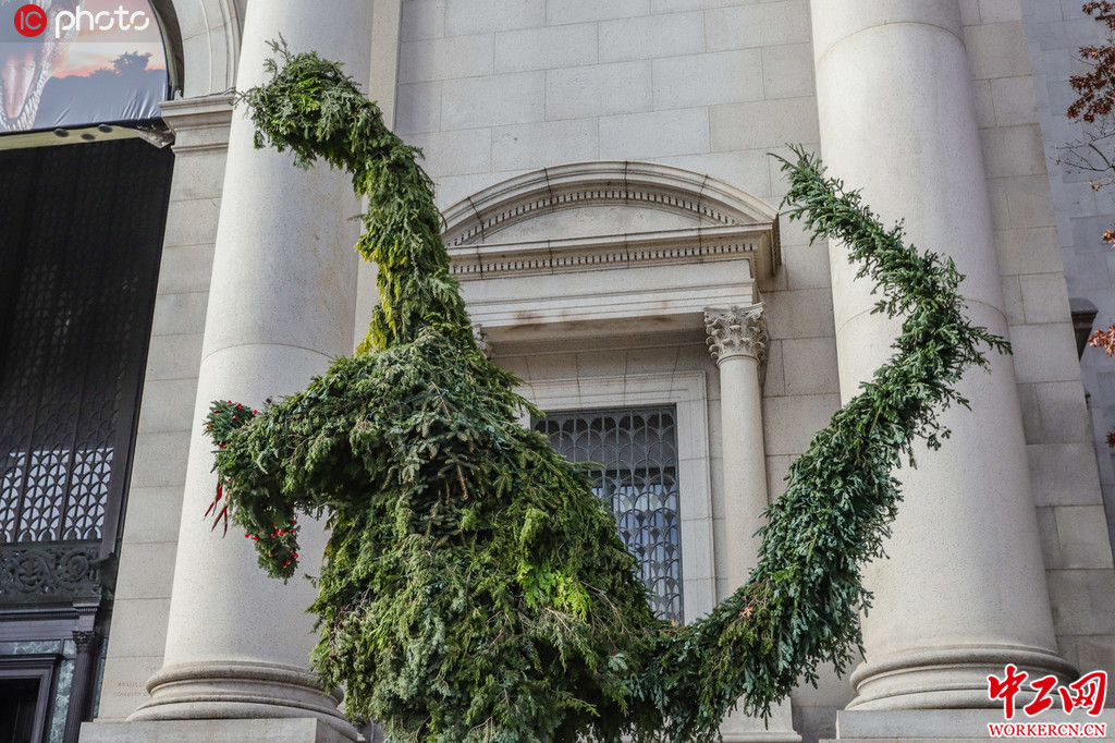 当地时间2019年11月17日,美国纽约,纽约自然历史博物馆前当天安装了一个恐龙造型的圣诞树,预热圣诞氛围。图片署名:  /zuma/IC photo