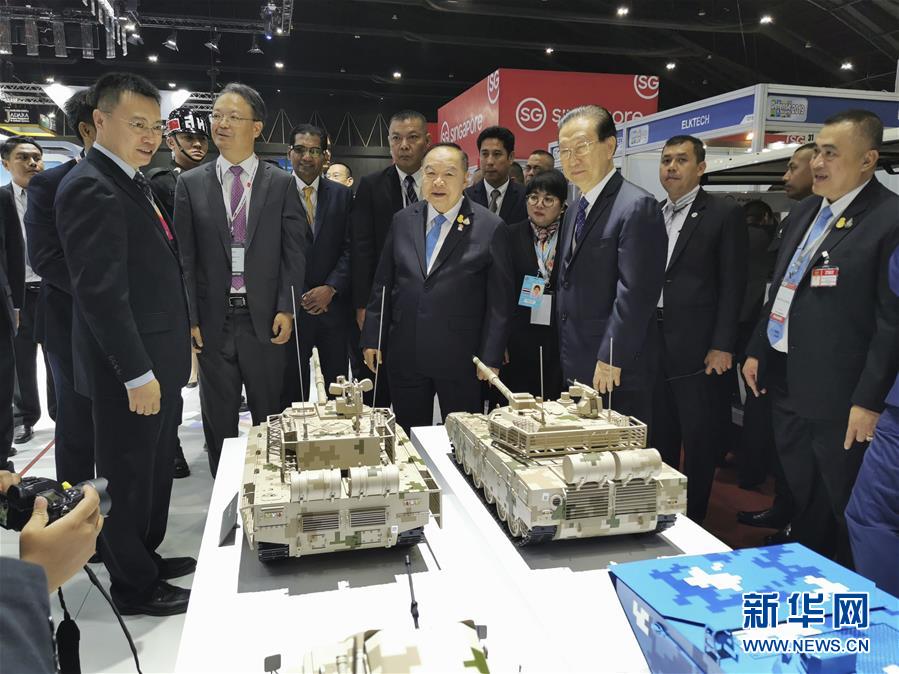 11月18日,泰国副总理巴威(中)在泰国曼谷举行的国际防务展上参观中国展区。 为期4天的2019年泰国国际防务展18日在曼谷开幕。中国国家国防科技工业局组织7家军贸公司以“中国军工”国家展团形式首次参展。 新华社发