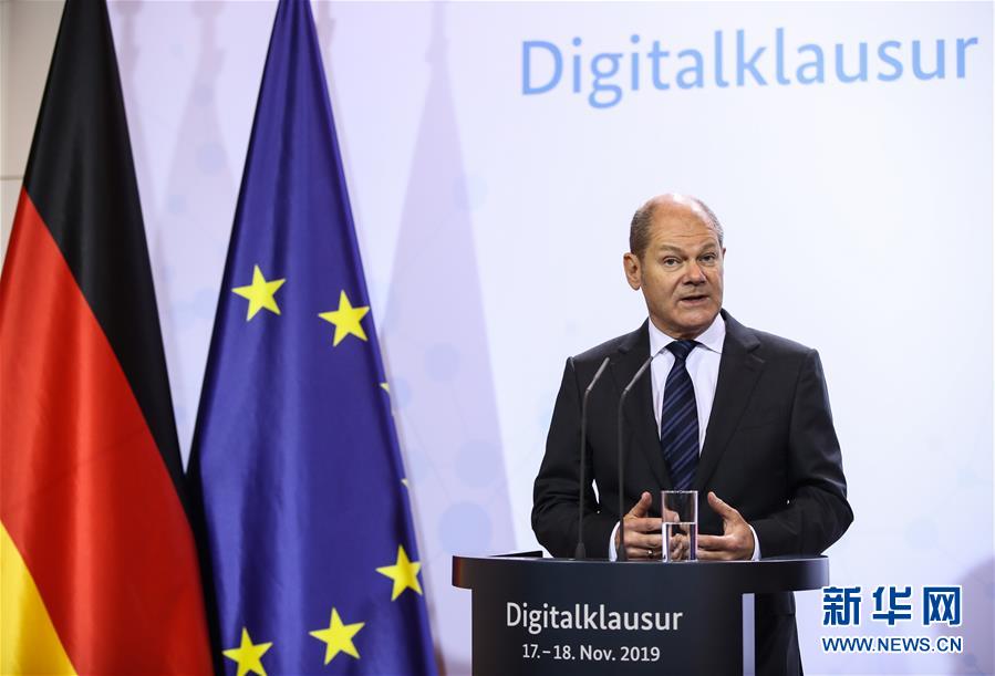 11月18日,在德国柏林以北的梅泽贝格,德国副总理兼财政部长肖尔茨出席新闻发布会。 德国政府18日通过一项“移动通信战略”,旨在加强移动通信基础设施建设,并为5G网络发展创造条件。 新华社记者 单宇琦 摄