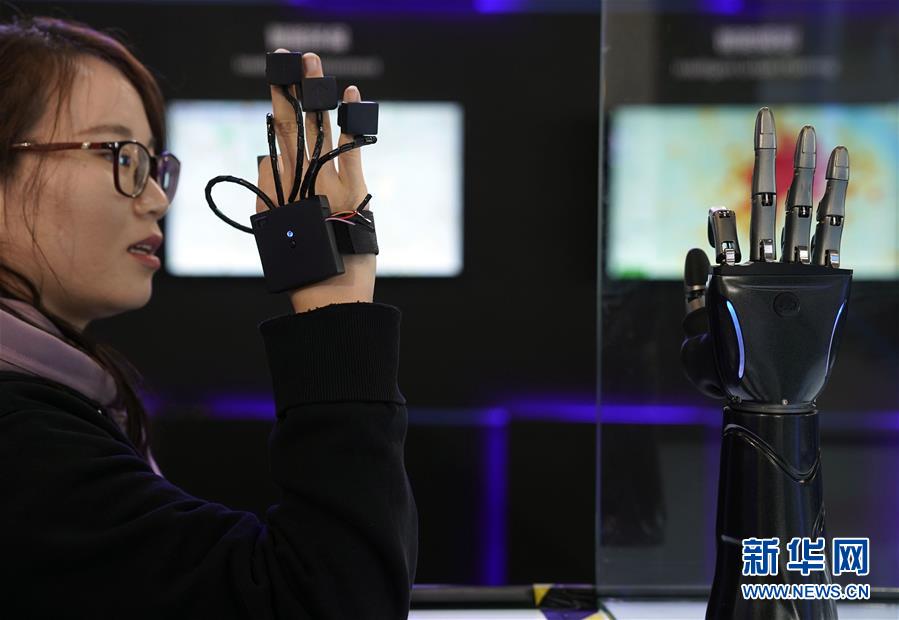11月19日,工作人员在京东全球科技探索者大会上演示一款智能可穿戴仿生手。新华社记者 金良快 摄