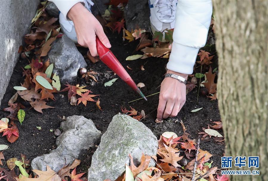 11月16日,在德国杜伊斯堡动物园,一名志愿者在郢趣园外墙下种植花卉。新华社记者 单宇琦 摄