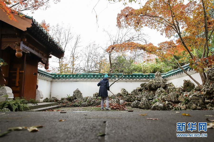 11月16日,在德国杜伊斯堡动物园,一名志愿者清扫郢趣园内的落叶。新华社记者 单宇琦 摄