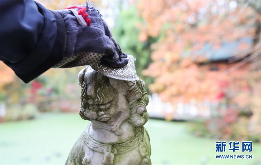 11月16日,在德国杜伊斯堡动物园,一名志愿者擦拭郢趣园内拱桥上的石狮。新华社记者 单宇琦 摄
