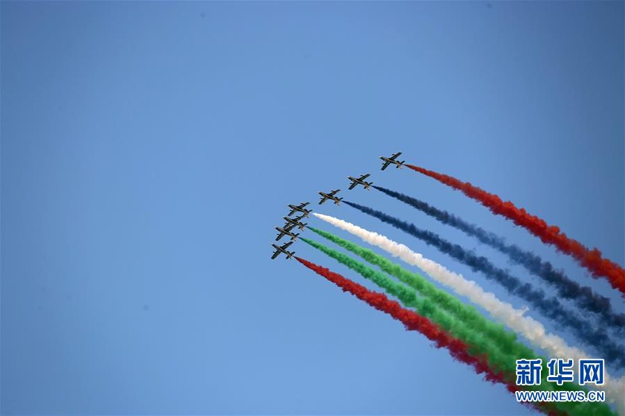 11月19日,在阿联酋迪拜,阿联酋“骑士”飞行表演队进行特技飞行表演。新华社记者苏小坡摄