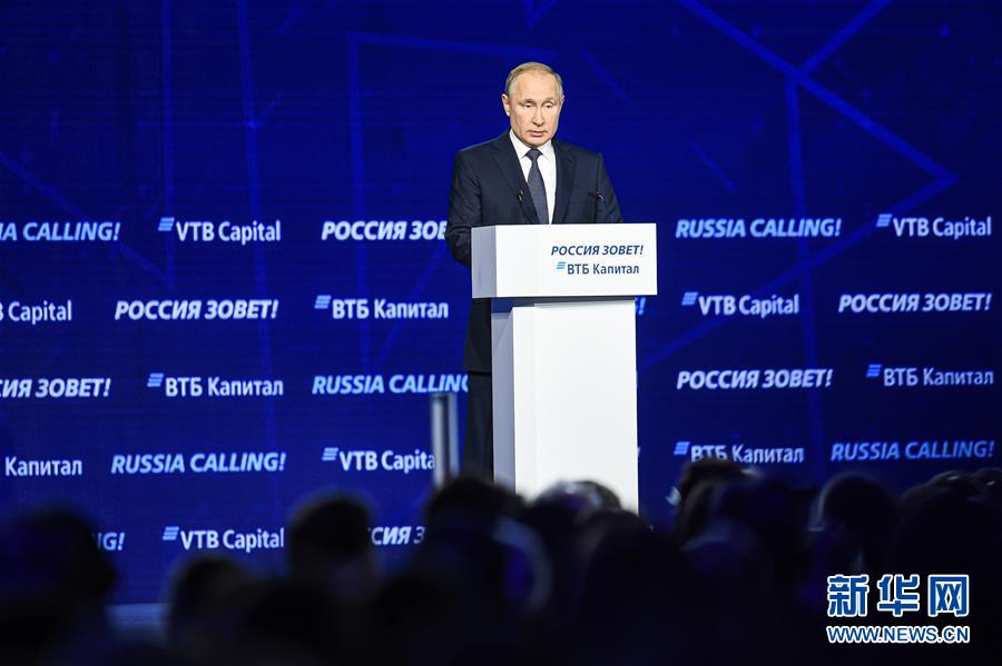 11月20日,在俄罗斯莫斯科,俄总统普京在“俄罗斯在召唤”年度国际投资论坛上讲话。 新华社发(叶甫盖尼·西尼岑摄)