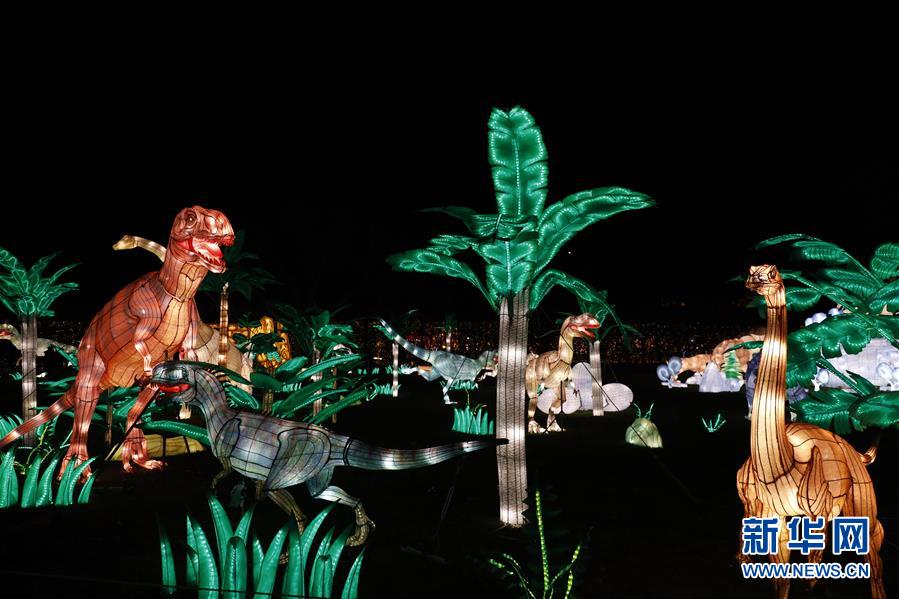 这是11月20日在美国纽约斯塔滕岛第二届纽约花灯游园会上拍摄的恐龙花灯。 当日,第二届纽约花灯游园会在美国纽约斯塔滕岛开幕,50余组各类花灯照亮夜空,吸引观众前来赏灯游玩。 新华社记者李木子摄