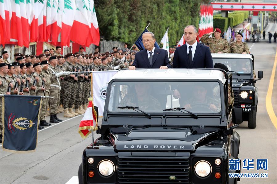 11月22日,在黎巴嫩巴卜达地区,黎巴嫩总统米歇尔·奥恩(中左)检阅士兵。 黎巴嫩22日举行阅兵活动,庆祝国家独立76周年。 新华社发(黎巴嫩官方摄影机构达拉提和努赫拉供图)