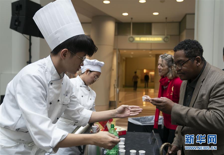 11月22日,在美国华盛顿,人们在“北京日”文化庙会活动上品尝中国小吃。 作为中国北京和美国首都华盛顿缔结友好城市35周年庆祝活动的一部分,“北京日”文化庙会22日在华盛顿罗纳德·里根大厦和国际贸易中心举行。 新华社记者 刘杰 摄