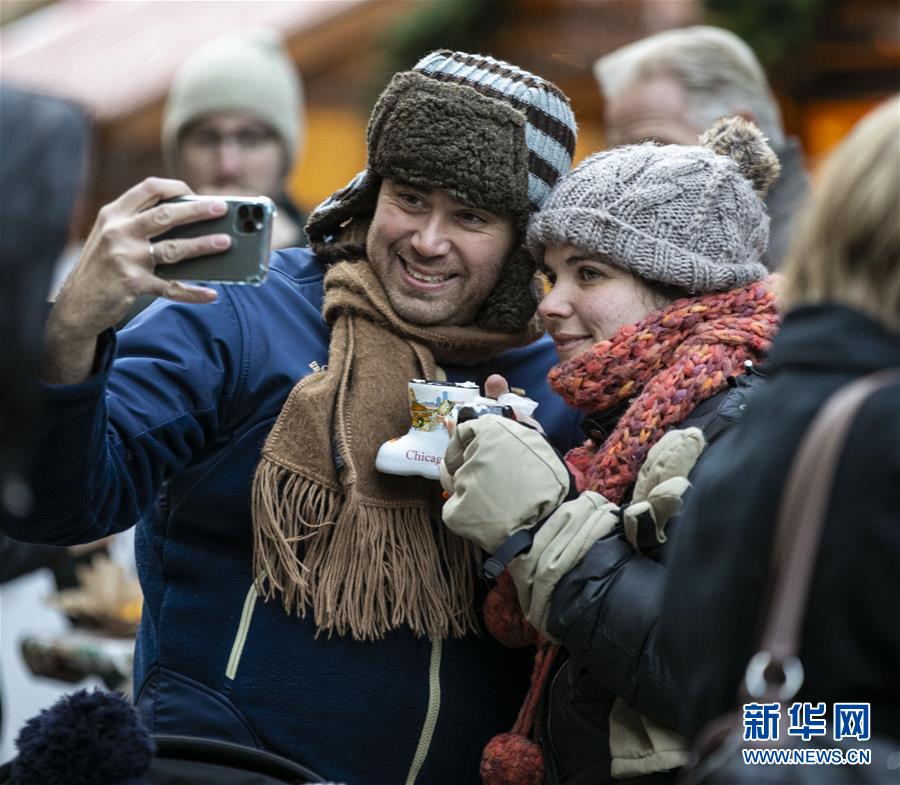 11月22日,在美国芝加哥,民众在圣诞市场上自拍。 位于美国芝加哥市中心戴利广场的圣诞市场每年从11月感恩节前后到圣诞节结束之前开放,是芝加哥最受欢迎的冬季景点之一。 新华社发(乔尔·莱纳摄)