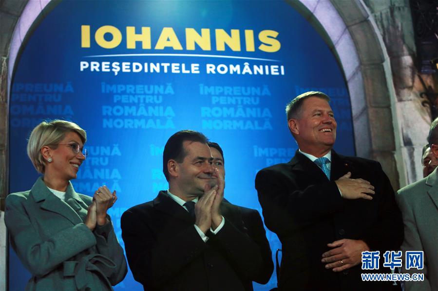 11月24日,在罗马尼亚首都布加勒斯特,罗马尼亚现任总统约翰尼斯(右一)在出口民调结果公布后庆祝。 罗马尼亚总统选举第二轮投票24日结束。出口民调显示,国家自由党支持的候选人、现任总统约翰尼斯赢得总统选举。 新华社发(彼得雷斯库摄)