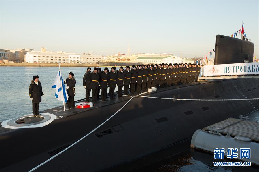 11月25日,在俄罗斯圣彼得堡,俄罗斯士兵在“堪察加彼得罗巴甫洛夫斯克”号潜艇上升起海军旗帜。 新华社发(莫京娜 摄)