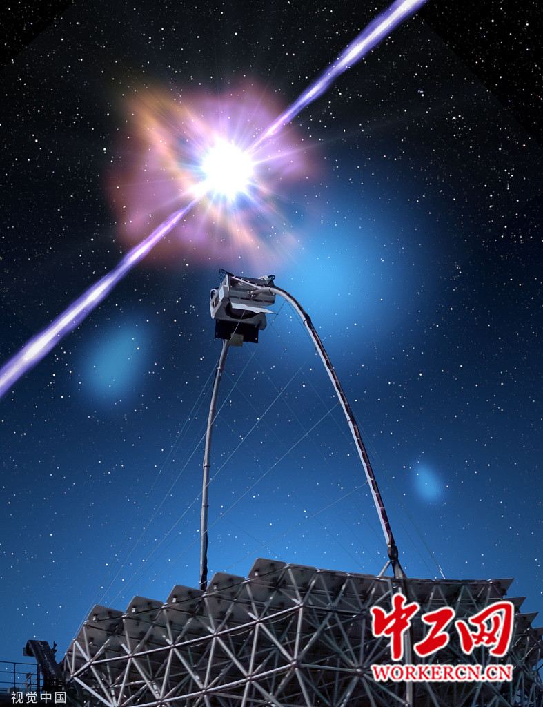 2019年11月25日讯,据英国《每日邮报》当地时间11月20日报道,来自澳大利亚科廷大学的研究人员发现,在遥远的星系发生了一次威力巨大的宇宙爆炸,其所产生的光线是迄今为止在地球上能看到的最亮的光。图为一幅有伽马射线爆发和神奇伽马射线望远镜(MAGIC)的艺术图。图片作者:SWNS/视觉中国