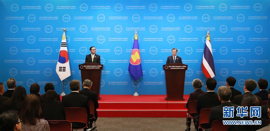 11月26日,在韩国釜山,韩国总统文在寅(右)和泰国总理巴育在会后共同会见记者。 韩国-东盟特别峰会25日至26日在韩国釜山举行,韩国总统文在寅以及东盟10国领导人和高级官员参会。 新华社发(2019韩国-东盟特别峰会组委会提供)