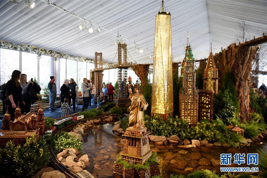 11月26日,在美国纽约植物园节日小火车展上,游客观看自由女神像和曼哈顿高楼微缩模型。 新华社记者 韩芳 摄