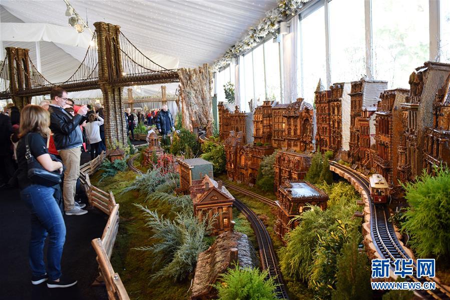 11月26日,在美国纽约植物园节日小火车展上,游客观看模型小火车和纽约微缩景观。 新华社记者 韩芳 摄