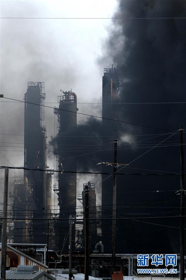 11月27日,在美国得克萨斯州杰斐逊县,发生爆炸的化工厂浓烟滚滚。 美国得克萨斯州杰斐逊县内奇斯港一座化工厂27日凌晨发生爆炸,目前造成3人受伤。 新华社发(宋穹 摄)