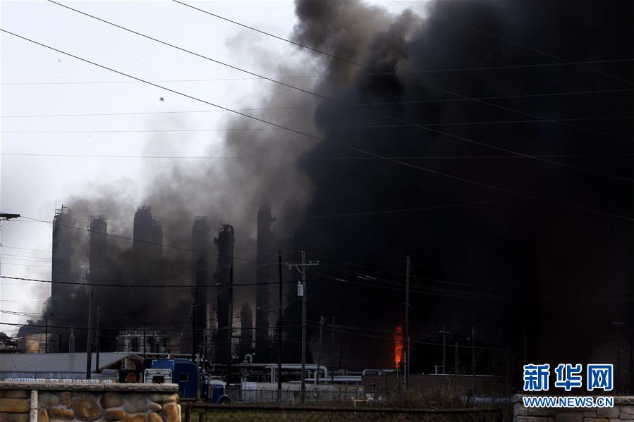 11月27日,在美国得克萨斯州杰斐逊县,发生爆炸的化工厂浓烟滚滚。 美国得克萨斯州杰斐逊县内奇斯港一座化工厂27日凌晨发生爆炸,目前造成3人受伤。 新华社发(宋穹 摄)