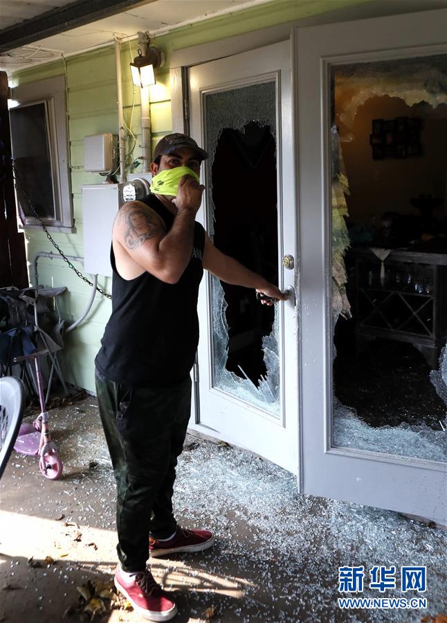 11月27日,在美国得克萨斯州杰斐逊县内奇斯港,当地居民的房门玻璃在附近化工厂爆炸中震碎。 美国得克萨斯州杰斐逊县内奇斯港一座化工厂27日凌晨发生爆炸,目前造成3人受伤。 新华社发(宋穹 摄)