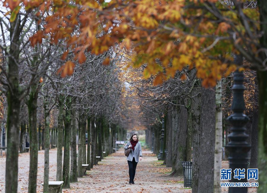 11月26日,在法国巴黎,一名女子走在杜勒里花园的林荫道上。 新华社记者 高静 摄