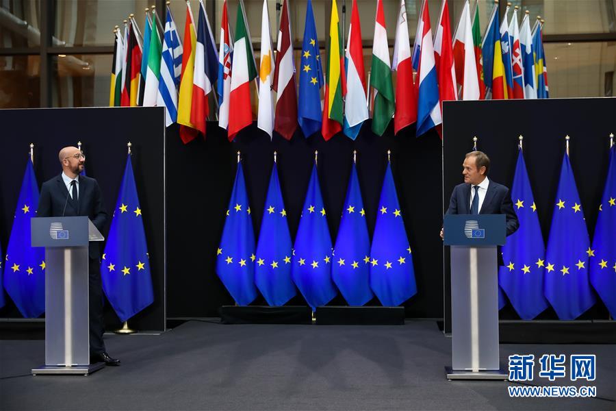 11月29日,在比利时布鲁塞尔的欧盟总部,现任欧洲理事会主席图斯克(右)与新当选的欧洲理事会主席米歇尔出席交接仪式。 当天,现任欧洲理事会主席图斯克与新当选的欧洲理事会主席米歇尔在比利时布鲁塞尔的欧盟总部举行交接仪式。今年7月2日,欧洲理事会选举比利时首相米歇尔担任下届欧洲理事会主席,他将于12月1日出任这一职务。 新华社记者 张铖 摄