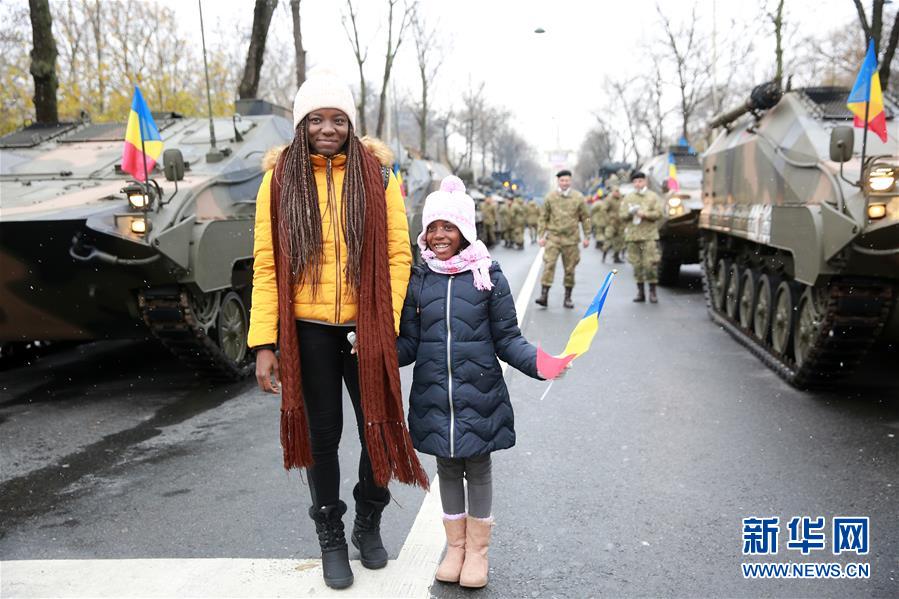 12月1日,在罗马尼亚首都布加勒斯特,人们在阅兵式现场合影。新华社发(彼得雷斯库 摄)