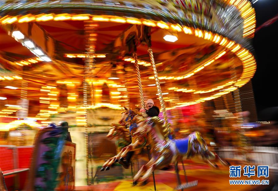 12月1日,在英国伦敦,一名儿童在“冬日仙境”圣诞市场乘坐旋转木马。 位于英国伦敦海德公园的2019“冬日仙境”圣诞市场近日开幕,各种小吃、工艺品、游乐设施吸引了众多游客。圣诞市场将持续至2020年1月5日。 新华社记者 韩岩 摄