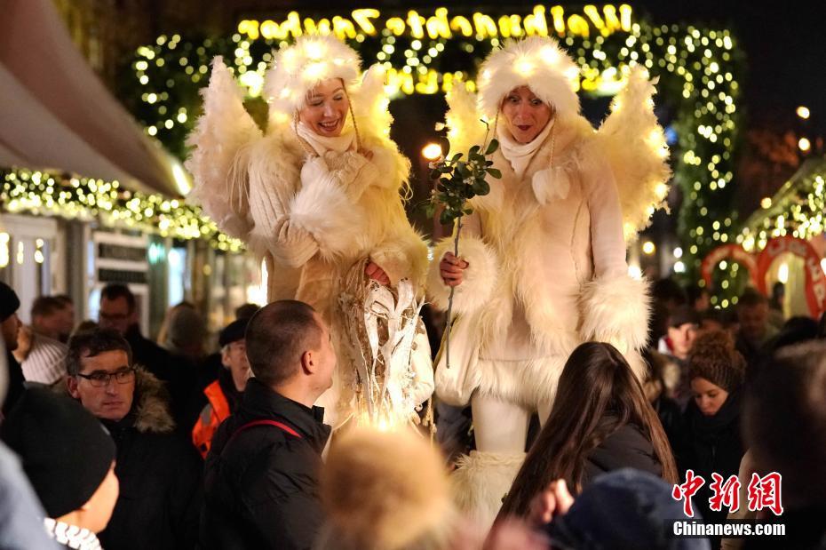 当地时间11月30日晚,两位演员在有柏林“最美广场”之称的御林广场(又译宪兵广场)圣诞集市上扮演“天使”。圣诞和新年是德国一年里最热闹的节庆。距离圣诞节不到一个月,德国各地的圣诞市场也陆续开门迎客。中新社记者 彭大伟 摄