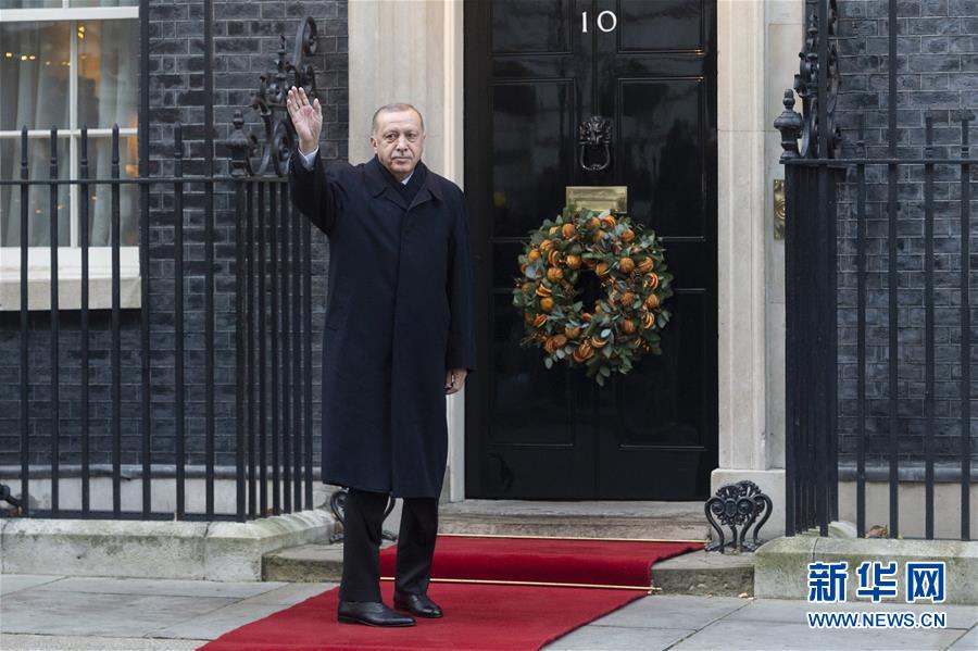 12月3日,在英国伦敦,土耳其总统埃尔多安抵达唐宁街10号首相府。 当日,法国、德国、土耳其三国领导人在出席北约峰会期间来到位于伦敦的唐宁街10号首相府,与英国首相进行会谈。 新华社发(雷伊·唐摄)