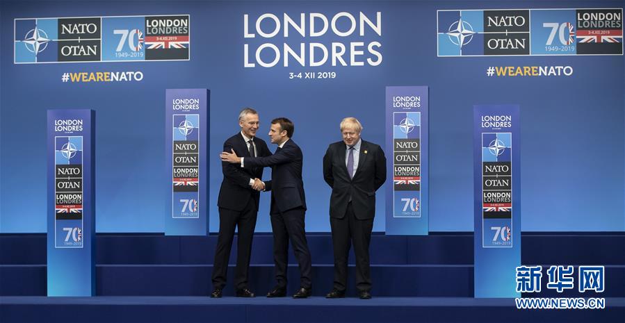 12月4日,在英国伦敦,北约秘书长斯托尔滕贝格(左)、英国首相鲍里斯·约翰逊(右)与法国总统马克龙在欢迎仪式上。 北大西洋公约组织(北约)峰会于12月3日至4日在英国伦敦举行。 新华社记者 韩岩 摄