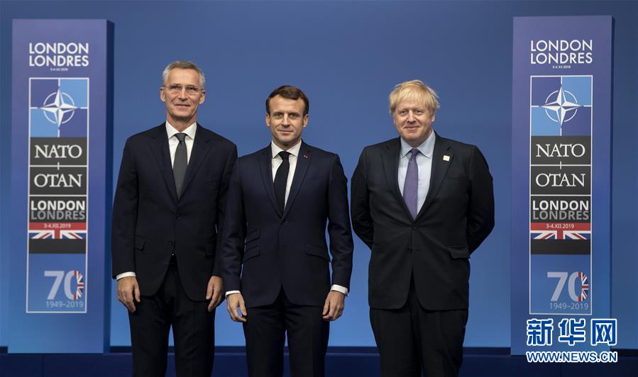 12月4日,在英国伦敦,北约秘书长斯托尔滕贝格(左)、英国首相鲍里斯·约翰逊(右)与法国总统马克龙在欢迎仪式上合影。 北大西洋公约组织(北约)峰会于12月3日至4日在英国伦敦举行。 新华社记者 韩岩 摄