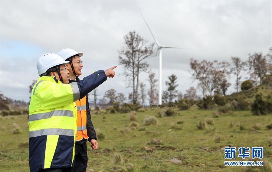 12月6日,在澳大利亚塔斯马尼亚州牧牛山风电项目现场,中国电建海外投资有限公司董事长盛玉明(左)与当地员工查看发电机组。