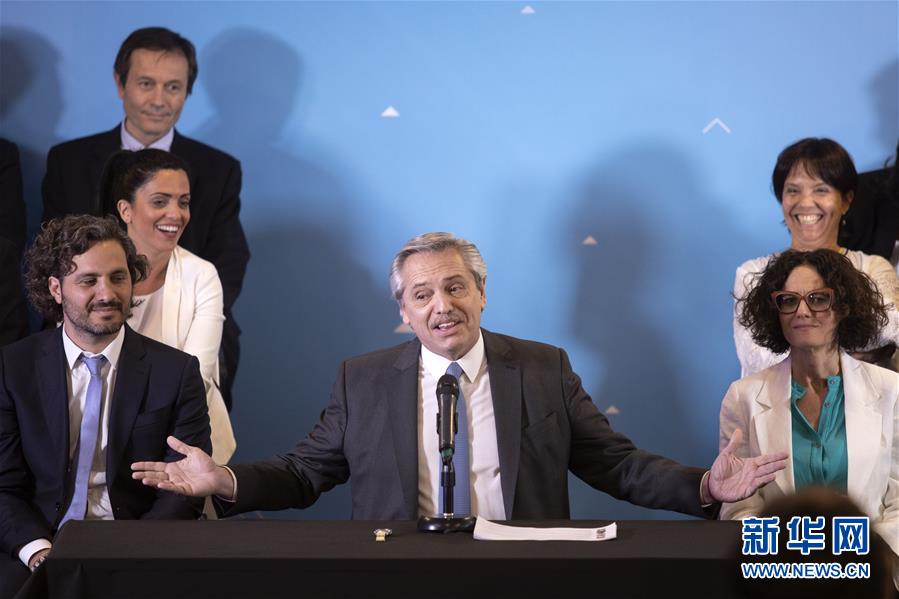 12月6日,阿根廷当选总统阿尔韦托·费尔南德斯(中)在布宜诺斯艾利斯宣布新内阁名单。 阿根廷当选总统阿尔韦托·费尔南德斯6日公布新内阁完整名单,包括1名内阁首席部长(总理)和20名部长。 新华社发(马丁·萨巴拉摄)