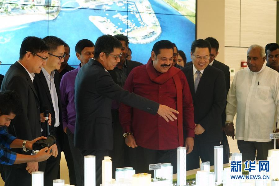 12月7日,在斯里兰卡科伦坡,斯里兰卡总理马欣达·拉贾帕克萨(前排中)在港口城项目展厅沙盘前听取介绍。 7日晚,由中国和斯里兰卡合作开发建设的科伦坡港口城举行盛大庆典,纪念该城正式成为斯永久土地。科伦坡港口城是斯里兰卡与中国的“一带一路”重点合作项目,建成后将成为南亚地区集金融、旅游、物流、IT等为一体的高端城市综合体。 新华社记者 唐璐 摄