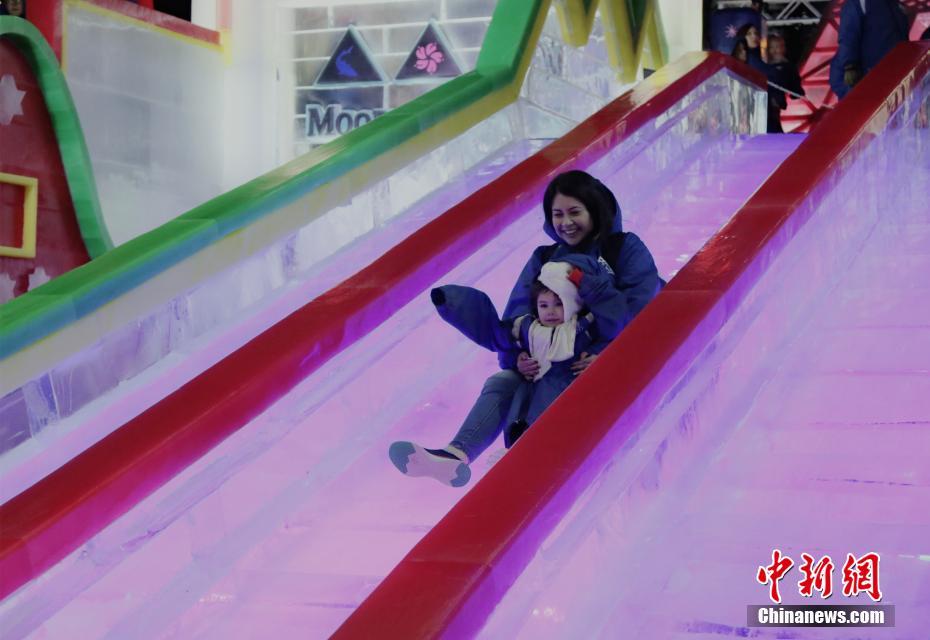 当地时间12月7日,美国得克萨斯州加尔维斯顿岛举行题为“环球圣诞”的冰雕展,吸引了大批游客参观游览。来自中国哈尔滨的25名冰雕技师耗时六周完成共计200万磅彩冰的雕琢,在美国南部呈现出中国长城、美国自由女神像、法国埃菲尔铁塔、英国大本钟、埃及金字塔等景观。图为游客在冰雕滑梯上玩耍。中新社记者 曾静宁 摄