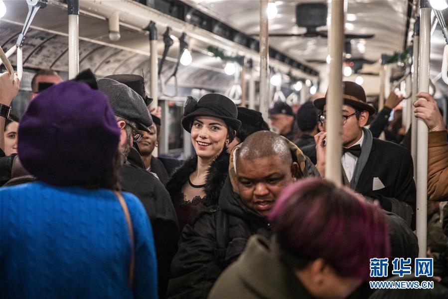 12月8日,在美国纽约,人们搭乘“怀旧专列”。 每年感恩节到新年之间的星期日,纽约地铁都会用1932年至1977年间使用的老式列车在运营的线路上开行特别的“怀旧专列”,人们穿戴旧时服饰专程前来搭乘,体验时光回溯的奇妙旅程。 新华社记者 王迎 摄