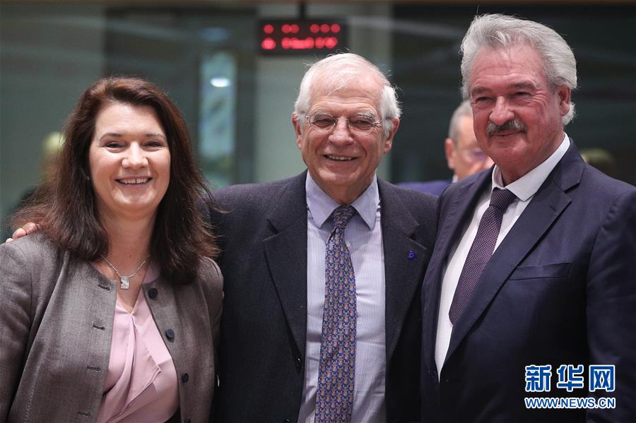 12月9日,在比利时首都布鲁塞尔,欧盟外交和安全政策高级代表何塞普·博雷利·丰特列斯(中)、瑞典外交大臣安·林德(左)和卢森堡外交大臣让·阿塞尔博恩在欧盟外长理事会会议前合影。新华社记者郑焕松摄