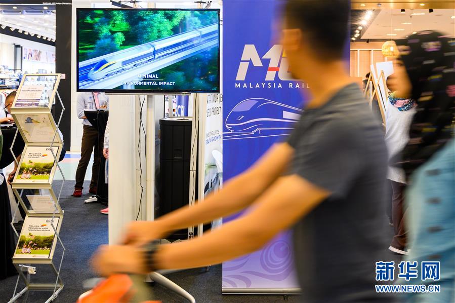 12月6日,在马来西亚关丹,一名男士观看东海岸铁路项目招聘活动上播放的介绍视频。新华社记者朱炜摄