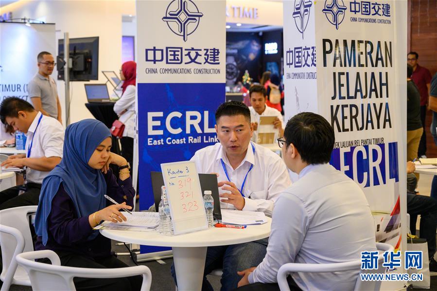 12月6日,在马来西亚关丹,一名求职者(右)参加东海岸铁路项目举行的招聘活动。新华社记者朱炜摄