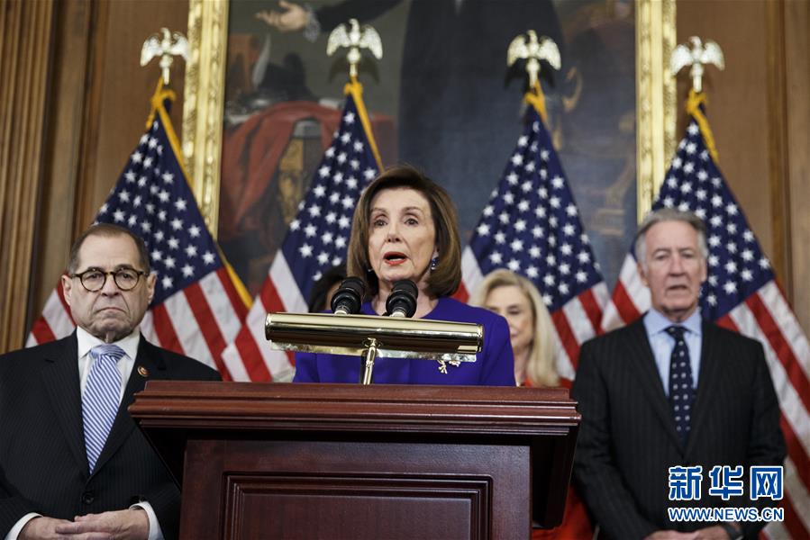 12月10日,美国国会众议院议长佩洛西(前)在华盛顿举行的新闻发布会上发言。 美国国会众议院司法委员会10日宣布针对总统特朗普的两项弹劾条款,指控他滥用职权和妨碍国会调查。 新华社发(沈霆摄)