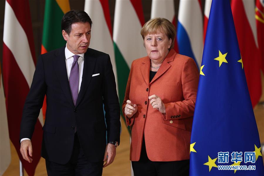 12月12日,在比利时布鲁塞尔的欧盟总部,德国总理默克尔(右)与意大利总理孔特出席欧盟冬季峰会合影仪式。 当日,2019年欧盟冬季峰会在比利时布鲁塞尔的欧盟总部举行。 新华社记者 郑焕松 摄