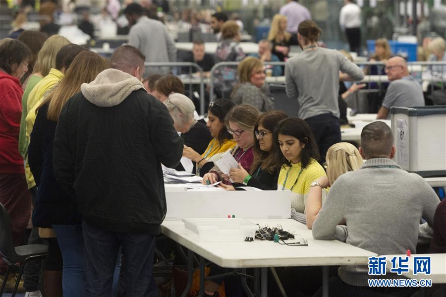 12月12日,在英国伦敦,工作人员在阿克斯布里奇选区的一处计票厅统计选票。阿克斯布里奇选区是首相鲍里斯·约翰逊所在选区。 新华社发(雷伊·唐摄)