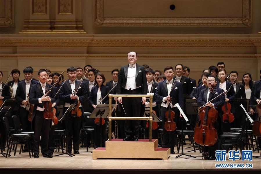 12月13日,在美国纽约,中央音乐学院院长、指挥家俞峰(中)带领中央音乐学院交响乐团在卡内基音乐厅演出时向观众致意。 13日晚,中央音乐学院交响乐团首次亮相美国纽约卡内基音乐厅,演奏“当代中国最活跃的八位作曲家”的作品,带给现场数千名观众和而不同的交响乐。 新华社记者 李木子 摄