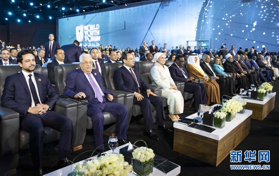 12月14日,在埃及沙姆沙伊赫,埃及总统塞西(左三)、巴勒斯坦总统阿巴斯(左二)等出席世界青年论坛开幕式。新华社记者 李碧念 摄