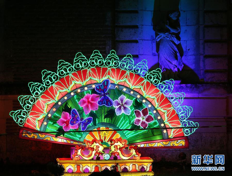 12月15日,在法国谢尔河畔塞勒市的塞纳古堡,中国彩灯与城堡雕塑相得益彰。 首届“塞纳古堡彩灯嘉年华”活动日前在法国谢尔河畔塞勒市的塞纳古堡开幕,39组造型别致、色彩鲜艳的自贡彩灯为有着千年历史的塞纳古堡披上了别样的节日盛装。“塞纳古堡彩灯嘉年华”活动将一直持续到中国春节。 新华社记者 高静 摄